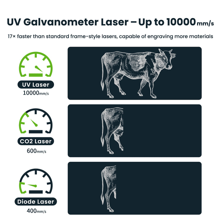 Featuring a spot precision of 0.0019 mm (50x smaller than diode, 100x smaller than CO₂), up to 16K resolution for ultra-HD engraving on almost any material.